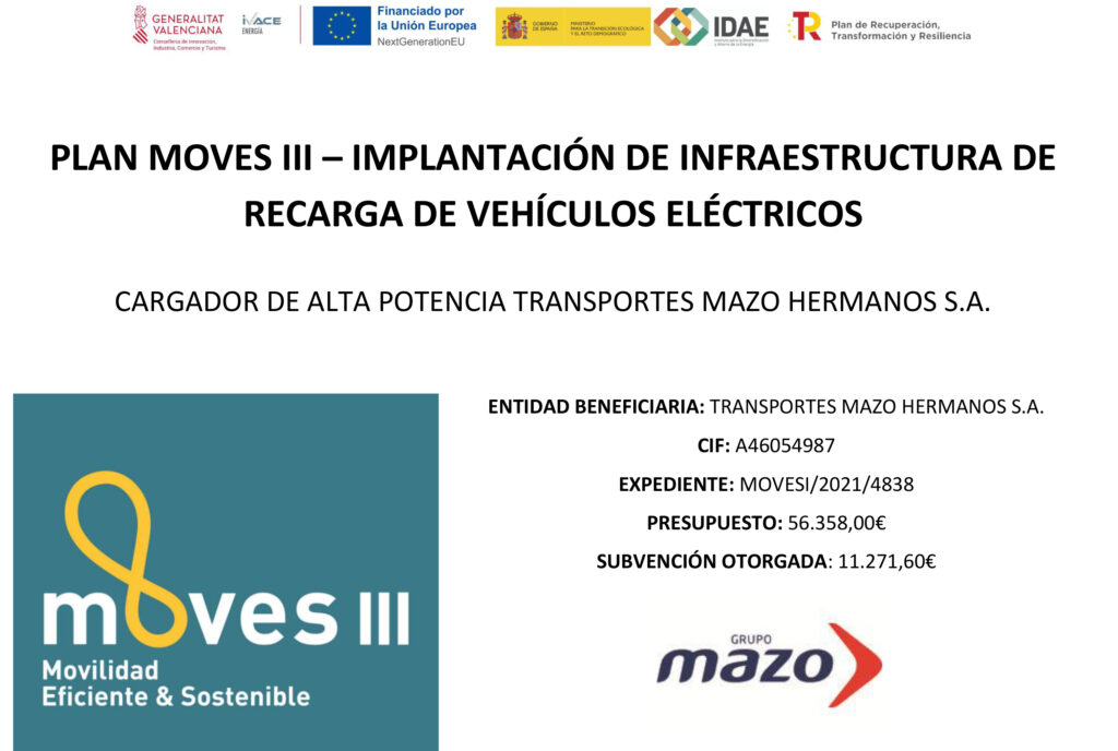 Este nuevo punto de recarga se encuentra en nuestras instalaciones y ha sido subvencionado en el marco del Plan MOVES III para la implantación de infraestructura de recarga de vehículos eléctricos: